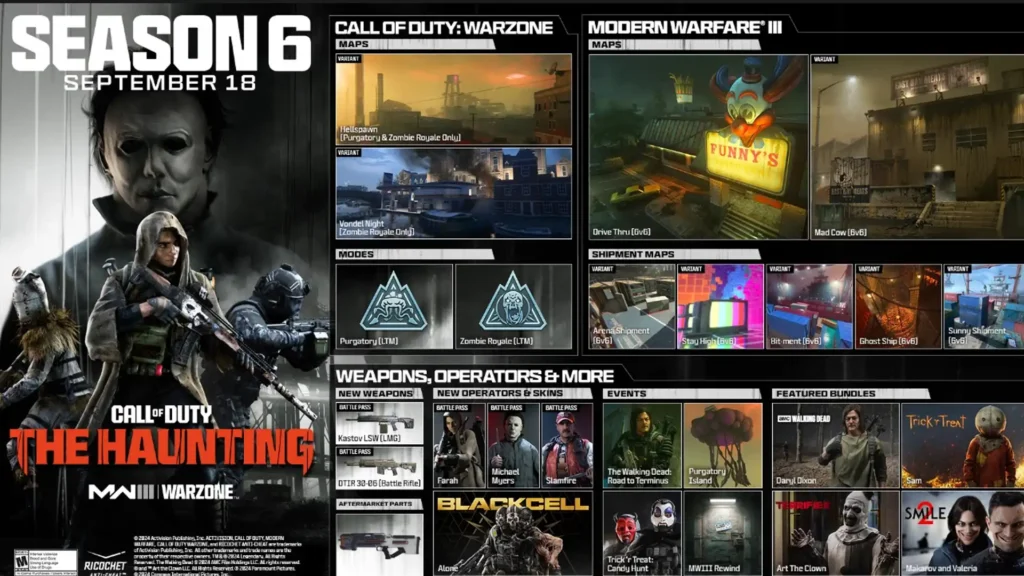 Entre as grandes novidades estão as participações especiais dos ícones do terror Michael Myers e Daryl Dixon, de The Walking Dead, como operadores jogáveis. A temporada ainda oferece eventos como o Trick ‘r Treat: Candy Hunt, onde os jogadores podem coletar doces de seus inimigos e trocá-los por recompensas.