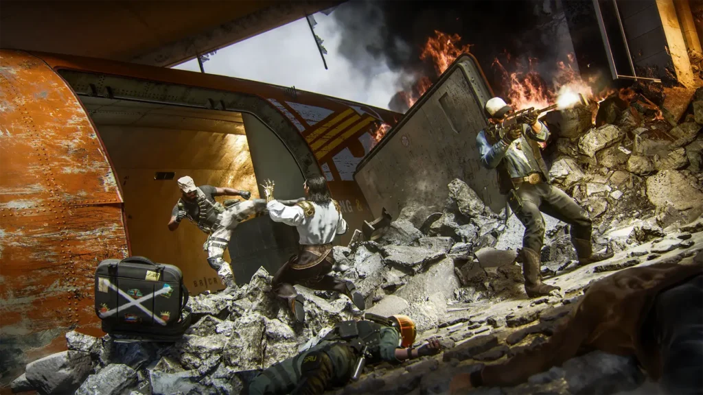 Runway transforma aeroporto em ruínas em campo de batalha épico, com destroços de aeronaves espalhados pela pista. Posteriormente, o terminal abriga Praça de Alimentação e área de bagagens, oferecendo múltiplos pontos estratégicos para emboscadas eficazes.