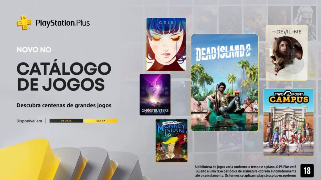 A PlayStation anunciou os títulos que chegam ao catálogo do PlayStation Plus Extra e Deluxe em outubro. A partir do dia 15, os assinantes terão acesso a uma seleção impressionante de jogos, com destaque para Dead Island 2, The Dark Pictures Anthology: The Devil in Me, Two Point Campus e Return to Monkey Island.