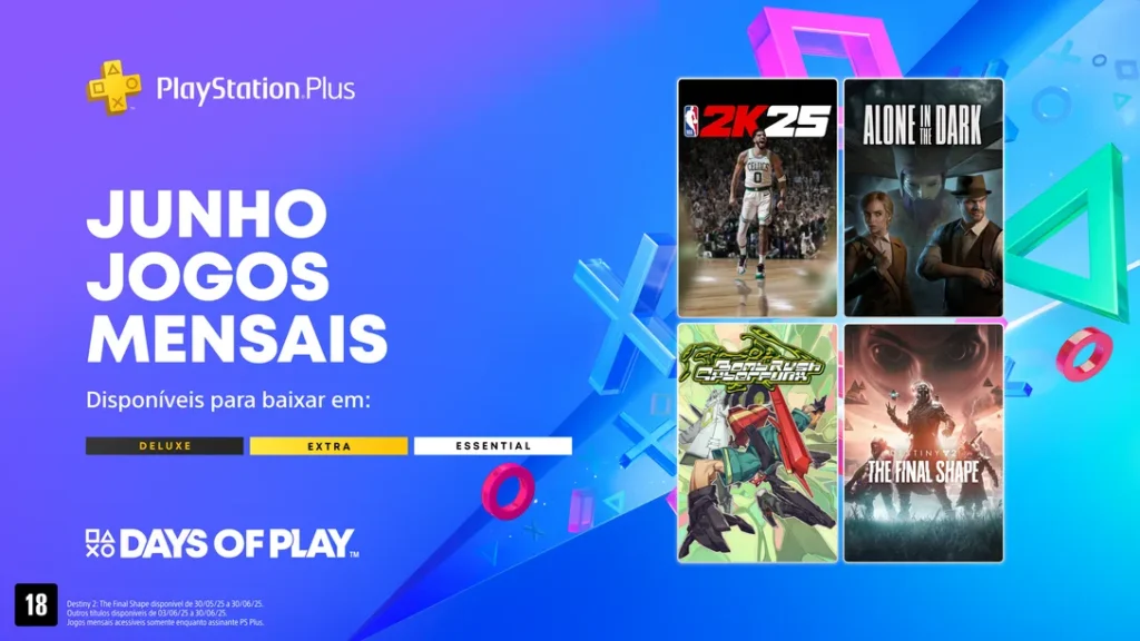 A PlayStation anunciou os jogos mensais do PlayStation Plus para junho de 2025, disponíveis a partir do dia 3. Entre os destaques estão NBA 2K25, Alone in the Dark e Bomb Rush Cyberfunk, além da expansão Destiny 2: A Forma Final.