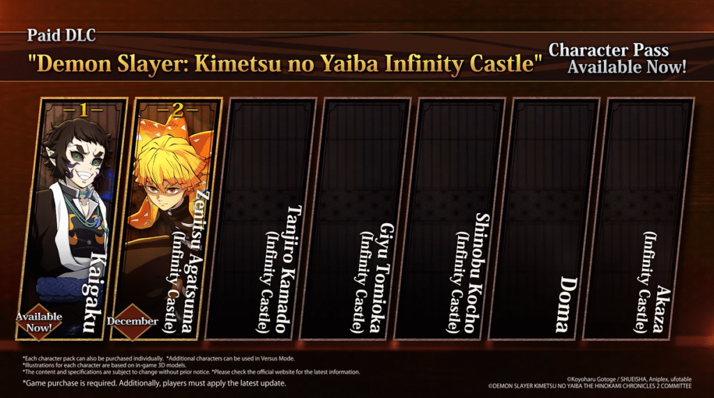 Fique de olho para mais atualizações das novas adições ao DLC Passe de Personagens, com Zenitsu Agatsuma (Castelo Infinito) chegando em dezembro de 2025.