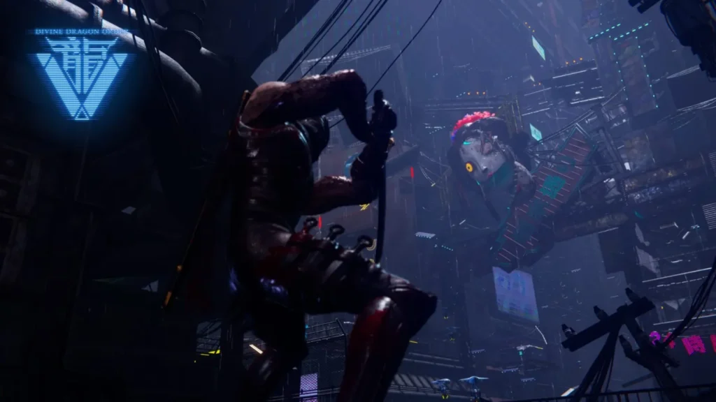 E olha… o jogo impressiona na construção de mundo. A fusão de conceitos como samurais e yōkais clássicos com um ambiente cyberpunk é algo que raramente vemos. Embora Ninja Gaiden 4 não seja um expoente gráfico, sua direção de arte é excelente. O uso de cores e sombras é impecável, especialmente nessa nova ambientação. Me recordo da luta em uma balada cheia de luzes neon, onde a estética visual elevou a experiência do combate a outro nível.