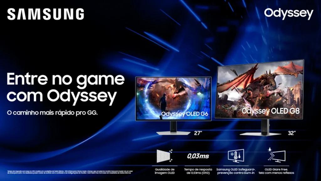 Samsung lança os monitores Odyssey OLED G6 e G8, trazendo 4K, 360Hz e tela grande para setups gamers que buscam alta performance e versatilidade