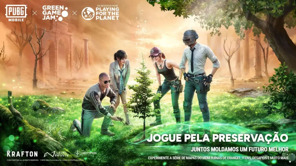 PUBG MOBILE lançou a campanha Play for Green, parte do Green Game Jam, para mobilizar jogadores em ações ambientais. A iniciativa inclui novos mapas, como as “Ruínas de Erangel”, que mostram o impacto das mudanças climáticas 100 anos à frente. Criado com base em dados reais, o mapa desafia jogadores a sobreviver em um ambiente devastado por tempestades de areia.