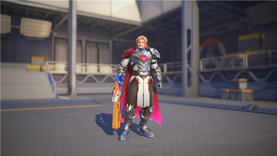 Com esse visual que (parece o príncipe do Shrek), a skin destaca o cavalheirismo de um bravo homem que daria a vida por quem ama. Com o coração no peito e uma capa vermelha que acende as chamas do amor, essa skin do Soldado: 76 é muito linda e obrigatória para quem é main do personagem.