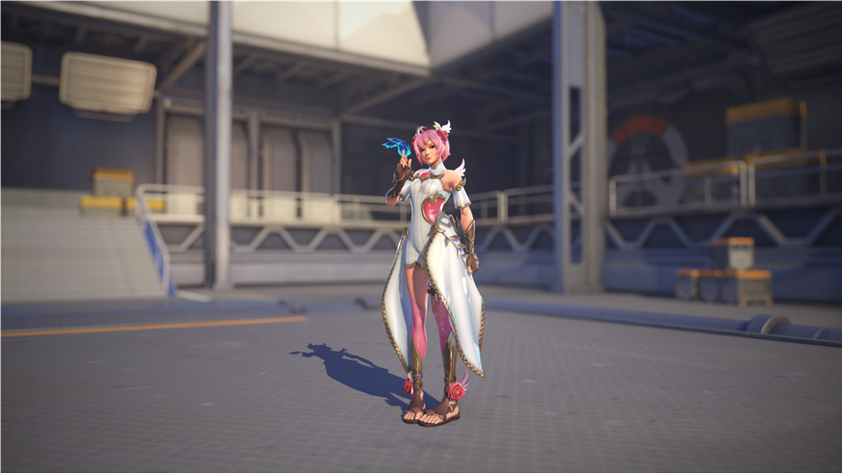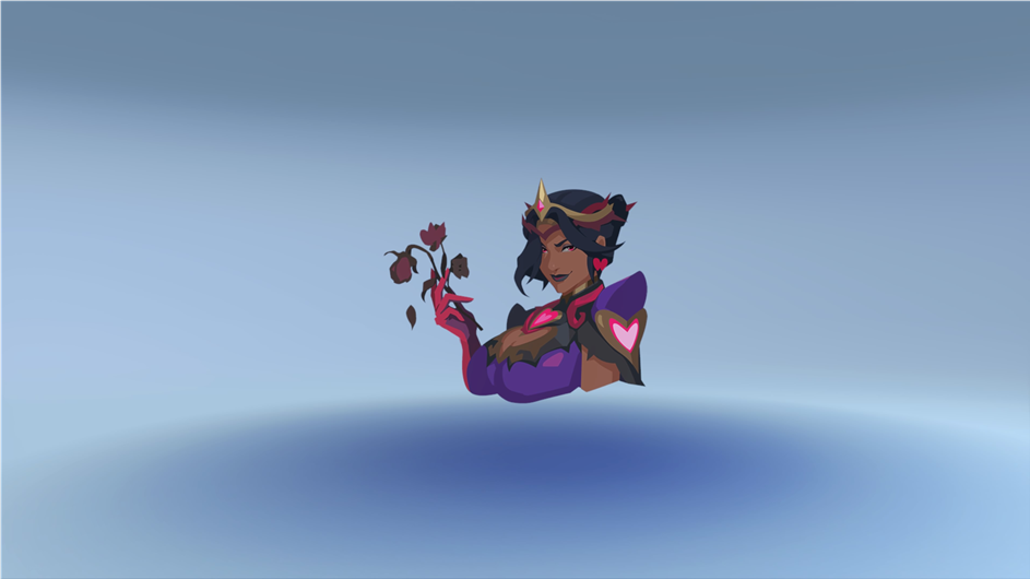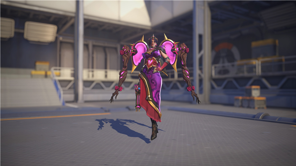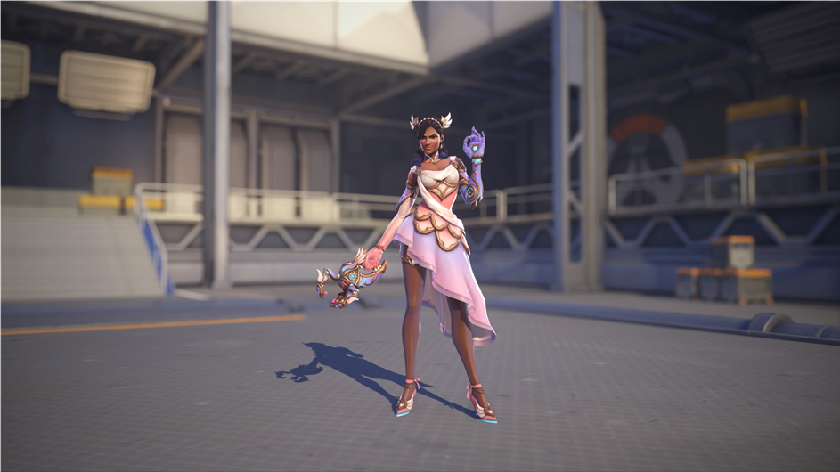 O longo vestido rosa dela e a luva grande em seu braço direito além de detalhes em sua tiara e sua arma que a primeira vista nem parece que lança um feixe de luz que é difícil counterar (alô jogadores de D.VA e Genji) a skin Romantismo de Symmetra é mostra que a elegância também se destaca no amor, não apenas o desejo e a paixão.