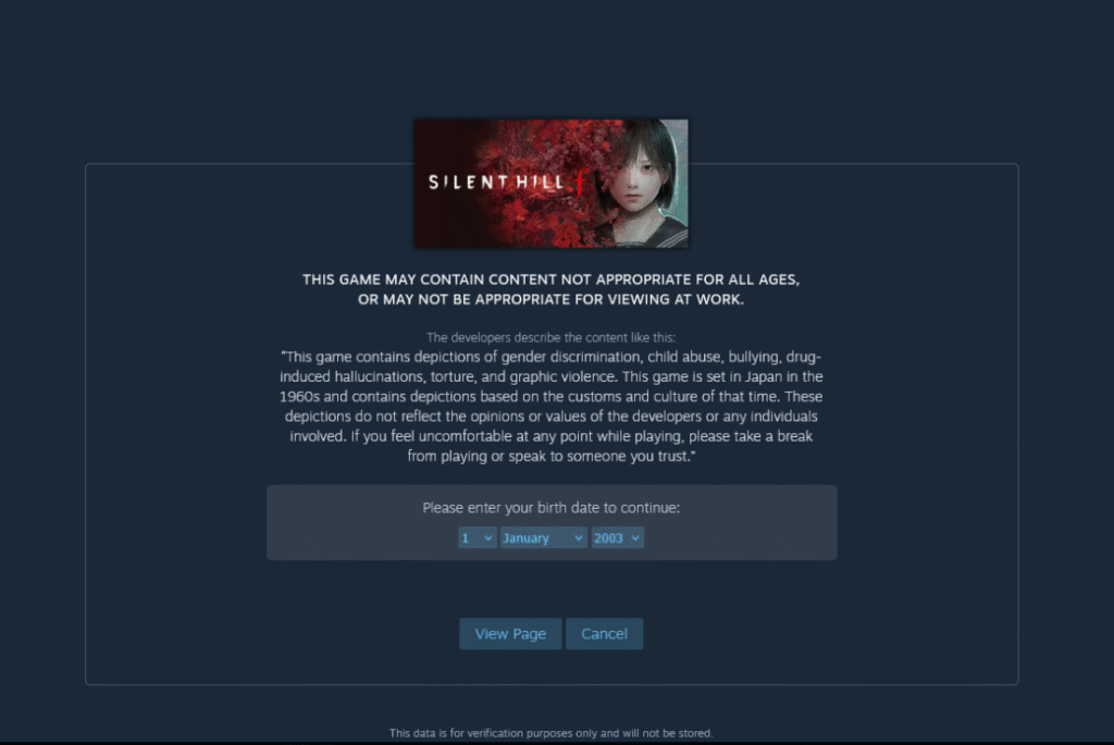 Silent Hill F é, para mim, o jogo mais diferente da franquia, e não falo apenas por se passar no Japão, mas também por trazer personagens que são jovens estudantes. Temos, assim, uma perspectiva diferente da história. Não que Silent Hill F vá ser mais leve por causa disso… Tanto é que, ao entrar na página do jogo na Steam, você já se depara com este aviso: