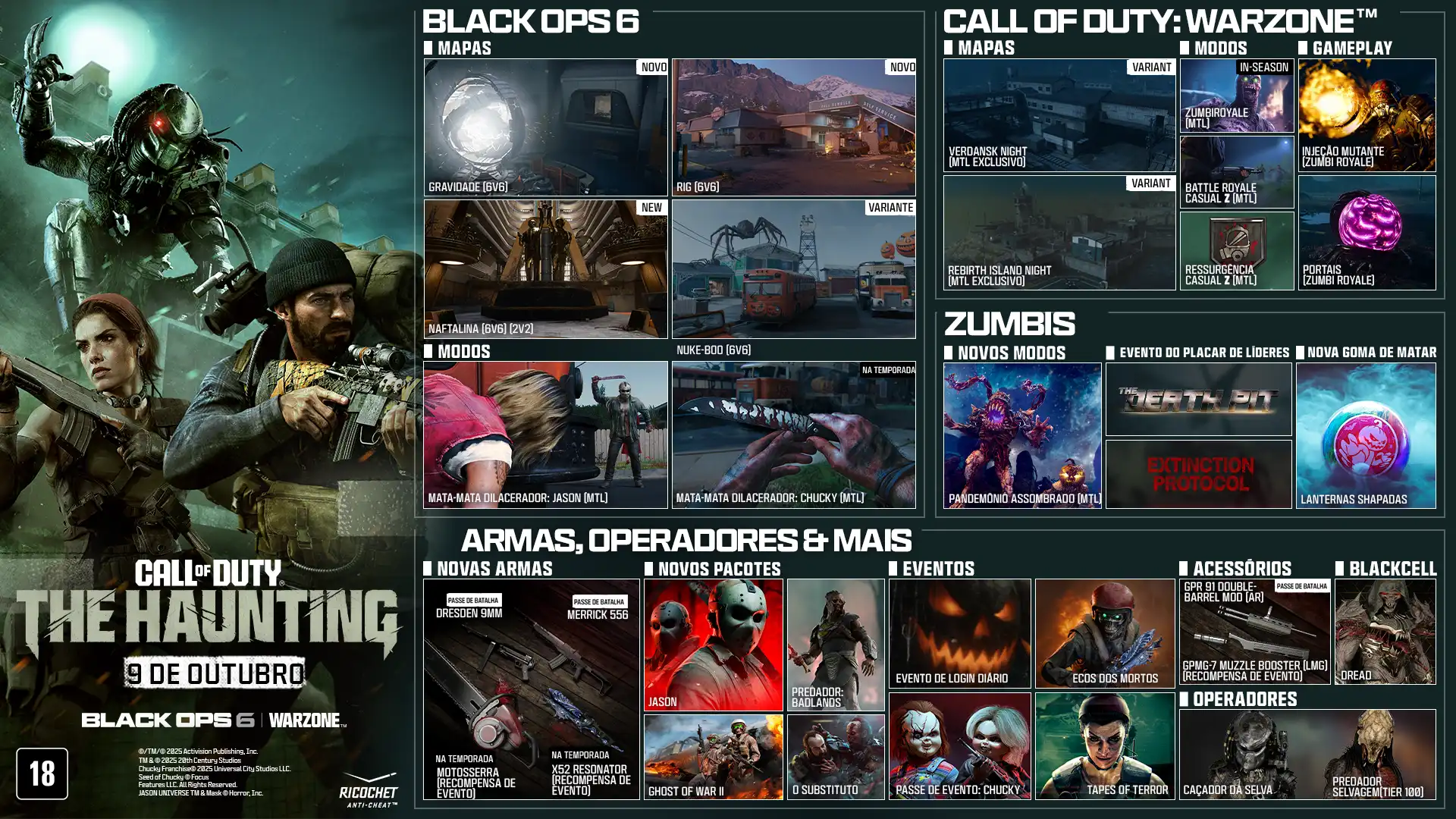 A Temporada 6 de Call of Duty: Black Ops 6 e Warzone estreia em 9 de outubro com o retorno de The Haunting. O evento traz um clima intenso de Halloween, combinando terror, ação e surpresas temáticas. Jogadores enfrentam novas ameaças nos modos temporários e desbloqueiam recompensas especiais em eventos e no Passe de Batalha.